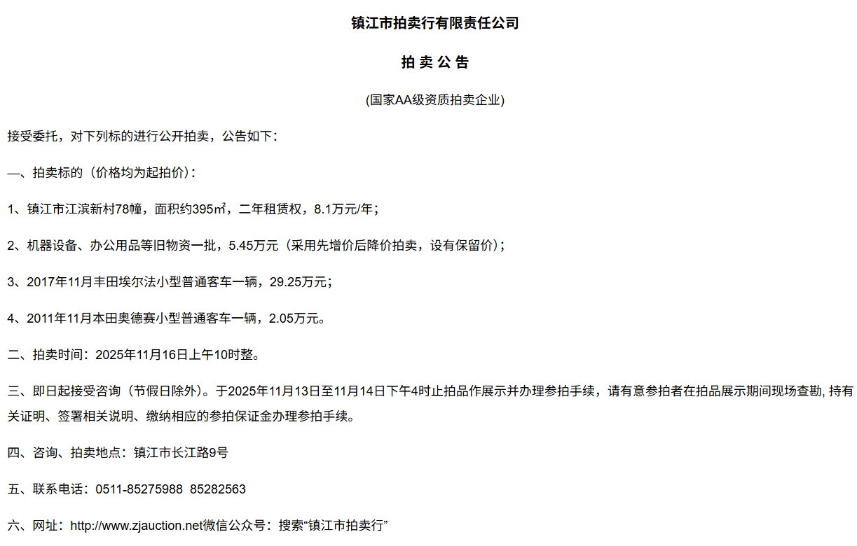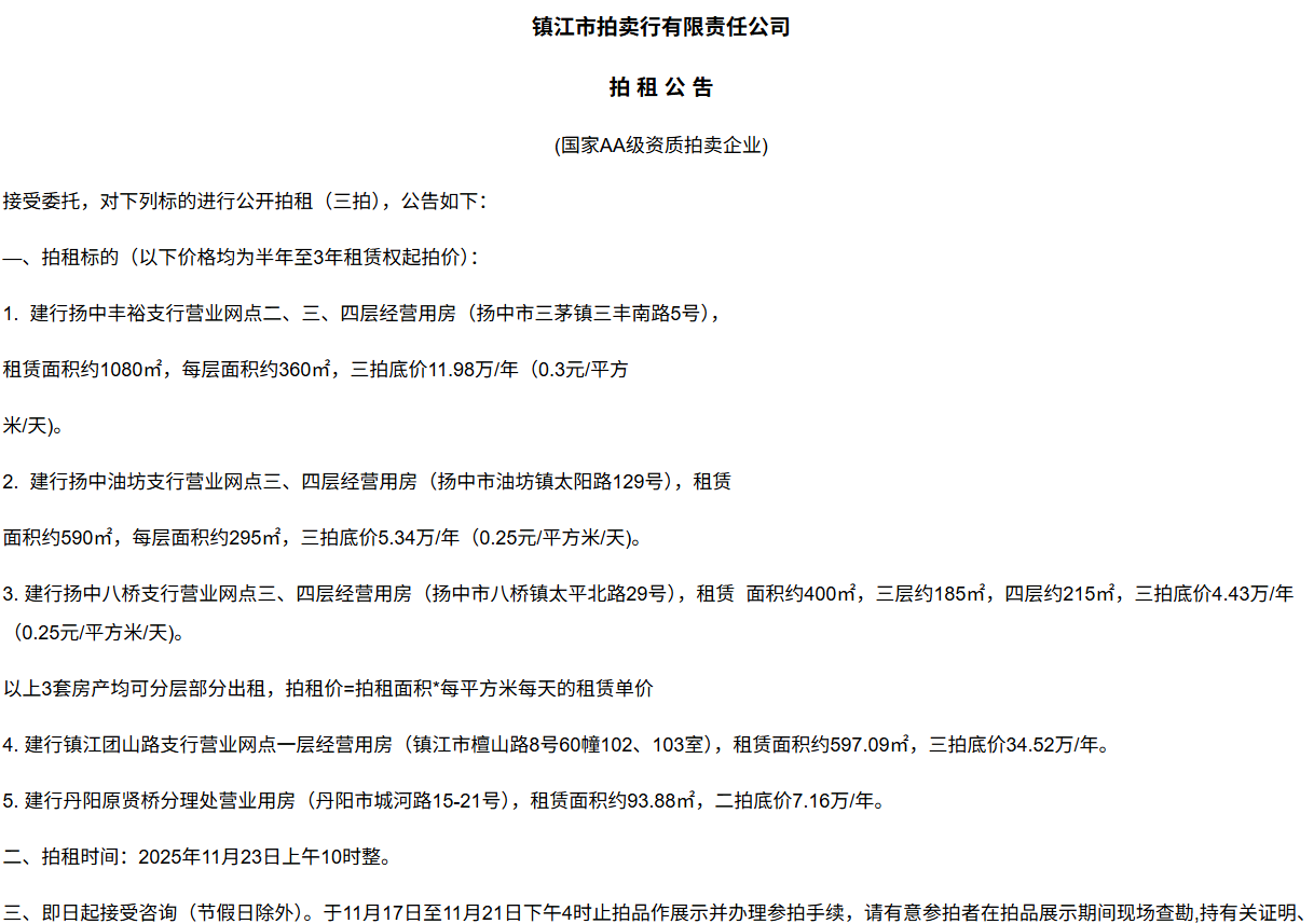 鎮江市拍賣行有限責任公司拍 租 公 吿(國家AA級資質拍賣企業)接受委托,對下列標的進行公開拍租(三拍),公告如下:—、拍租標的(以下價格均為半年至3年租賃權起拍價):1.  建行揚中豐裕支行營業網點二、三、四層經營用房(揚中市三茅鎮三豐南路5號),租賃面積約1080㎡,每層面積約360㎡,三拍底價11.98萬/年(0.3元/平方米/天)。2.  建行揚中油坊支行營業網點三、四層經營用房(揚中市油坊鎮太陽路129號),租賃面積約590㎡,每層面積約295㎡,三拍底價5.34萬/年(0.25元/平方米/天)。3. 建行揚中八橋支行營業網點三、四層經營用房(揚中市八橋鎮太平北路29號),租賃  面積約400㎡,三層約185㎡,四層約215㎡,三拍底價4.43萬/年(0.25元/平方米/天)。以上3套房產均可分層部分出租,拍租價=拍租面積*每平方米每天的租賃單價4. 建行鎮江團山路支行營業網點一層經營用房(鎮江市檀山路8號60幢102、103室),租賃面積約597.09㎡,三拍底價34.52萬/年。5. 建行丹陽原賢橋分理處營業用房(丹陽市城河路15-21號),租賃面積約93.88㎡,二拍底價7.16萬/年。二、拍租時間:2025年11月23日上午10時整。三、即日起接受咨詢(節假日除外)。于11月17日至11月21日下午4時止拍品作展示并辦理參拍手續,請有意參拍者在拍品展示期間現場查勘,持有關證明、簽署相關說明、繳納相應的參拍保證金辦理參拍手續。四、咨詢、拍租地點:鎮江市長江路9號五、聯系方式:0511-85275988   13655299933楊先生六、網址:http://www_zjauction_net.rn4beautifulskin.com;微信公眾號:搜索“鎮江市拍賣行” 拍品清單2025.11.23序號名稱起拍價(元)標的說明1建行揚中豐裕支行營業網點二、三、四層經營用房(揚中市三茅鎮三豐南路5號),租賃面積約1080㎡,每層面積約360㎡三拍底價11.98萬/年(0.3元/平方米/天)1、1-3號房產均可分層部分出租,拍租價=拍租面積*每平方米每天的租賃單價;2、意向競拍人在拍賣前需持營業執照或身份證與委托方說明租賃房產經營業態,確定意向后出具房產承租用途承諾書,經委托方審核后,方可交納保證金參加競拍;3、租賃期限為半年至3年(承租方與出租方協商而定),承租方每半年或一年結付租金,租賃期間的水、電費用及其它相關費用均由承租方承擔;4、承租方不得用于經營和保管危險物品,不得用于開設餐飲、娛樂等可能嚴重影響消防安全、運營安全的經營業態,不得用于經營委托貸款、小額貸款等可能冒用委托方名義,帶來聲譽風險的經營業態。租賃期內,承租方不得破壞墻體結構,自行成就消防、安全等使用條件,不得擅自將租賃房屋轉租、轉讓給他人使用,否則委托方有權收回房屋;5、拍租成交后,承租方將租金交至出租方指定賬戶,傭金交至拍賣方賬戶(拍租傭金為該房屋一個月租金)。承租方憑租賃合同無息退還保證金。2建行揚中油坊支行營業網點三、四層經營用房(揚中市油坊鎮太陽路129號),租賃面積約590㎡,每層面積約295㎡三拍底價5.34萬/年(0.25元/平方米/天)3建行揚中八橋支行營業網點三、四層經營用房(揚中市八橋鎮太平北路29號),租賃面積約490㎡,每層面積約245㎡三拍底價4.43萬/年(0.25元/平方米/天)4建行鎮江團山路支行營業網點一層經營用房(鎮江市檀山路8號60幢102、103室),建筑面積約597.09㎡三拍底價34.52萬/年5建行丹陽原賢橋分理處營業用房(丹陽市城河路15-21號),建筑面積約93.88㎡二拍底價7.16萬/年